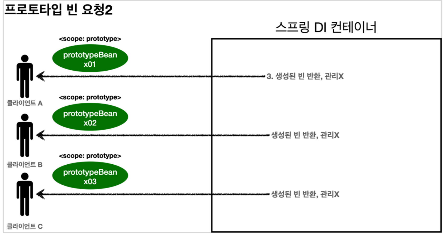 - 스프링 컨테이너는 생성한 프로토타입 빈을 클라이언트에 반환한다.