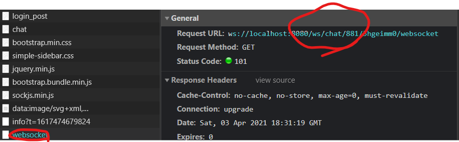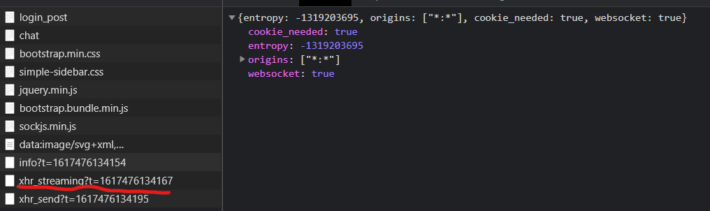 SockJS는 처음에 GET /info 요청을 날리는데, 이때의 응답으로 cookie_needed 속성을 볼 수 있다. 만약 Cookie가 필요하다고 표시되냐 안되냐에 따라 사용하는 기술이 달라진다